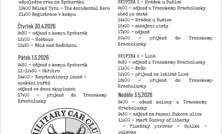 Convoy of Remembrance 2026 – REGISTRACE a UBYTOVÁNÍ Informace o rezervacích ubytování v jednotlivých kempech (29.4.-1.5. Kemp Sycherák a 1.5.-3.5. Transkemp Hracholusky) a registrační formulář pro Convoy of Liberty v Plzni. Kemp Sycherák Příjezd možný od středy 29.4. v odpoledních hodinách. V pátek 1.5. opouštíme Kemp Sycherák a na konci vyjížďky dorazíme na Hracholusky. Ubytování rezervujte přes email nebo telefonicky.…
